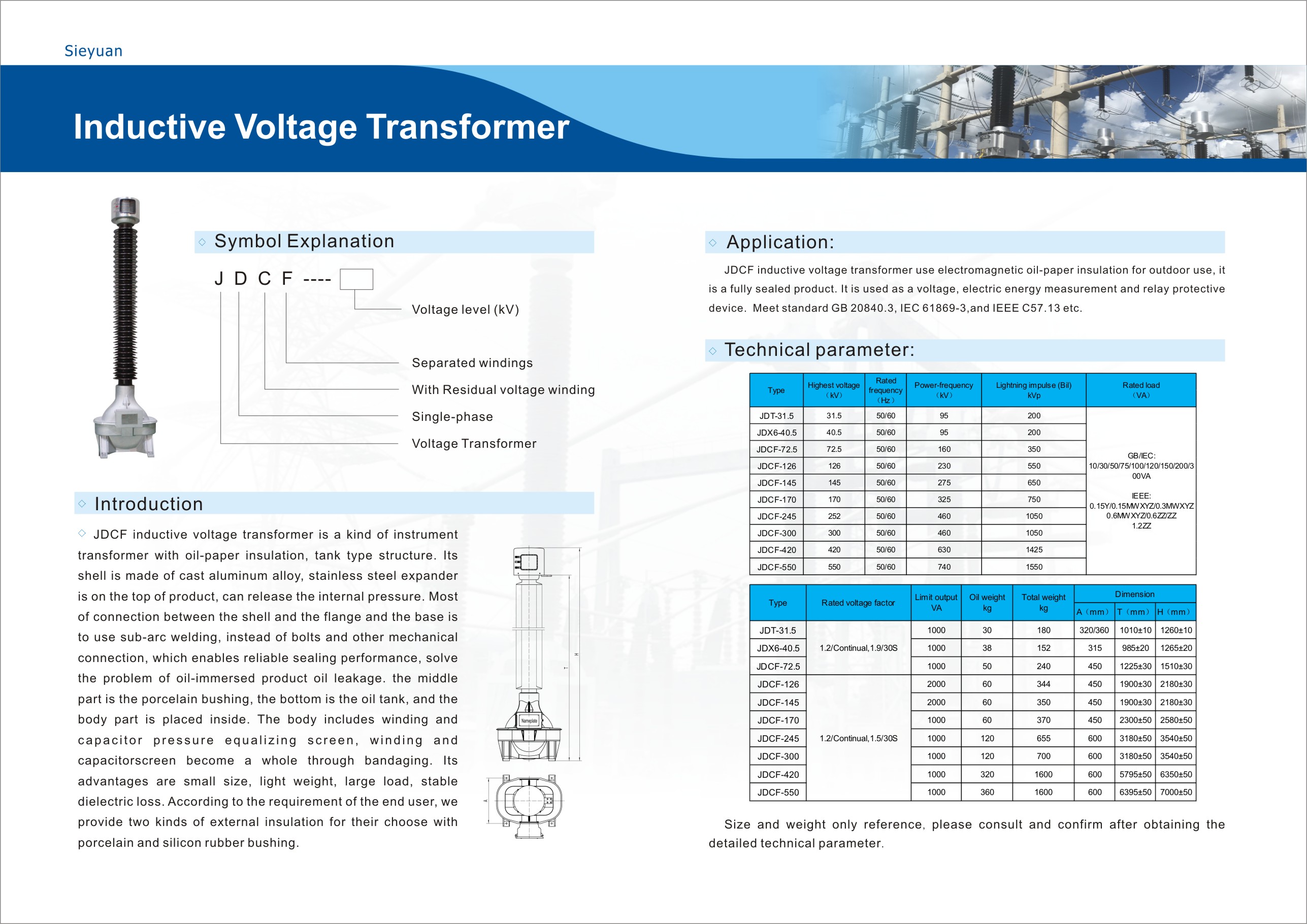 Индуктивный трансформатор напряжения имеет масляно-бумажную изоляцию, предназначен для использования вне помещений и имеет полностью герметичную конструкцию. Конструкция изделия надежна, высокоточна, легка, может удовлетворить требованиям высокоточных измерений различных пользователей. Масляный бак и открытые металлические части изготовлены из металлического алюминия, при длительном использовании не подвергаются коррозии.